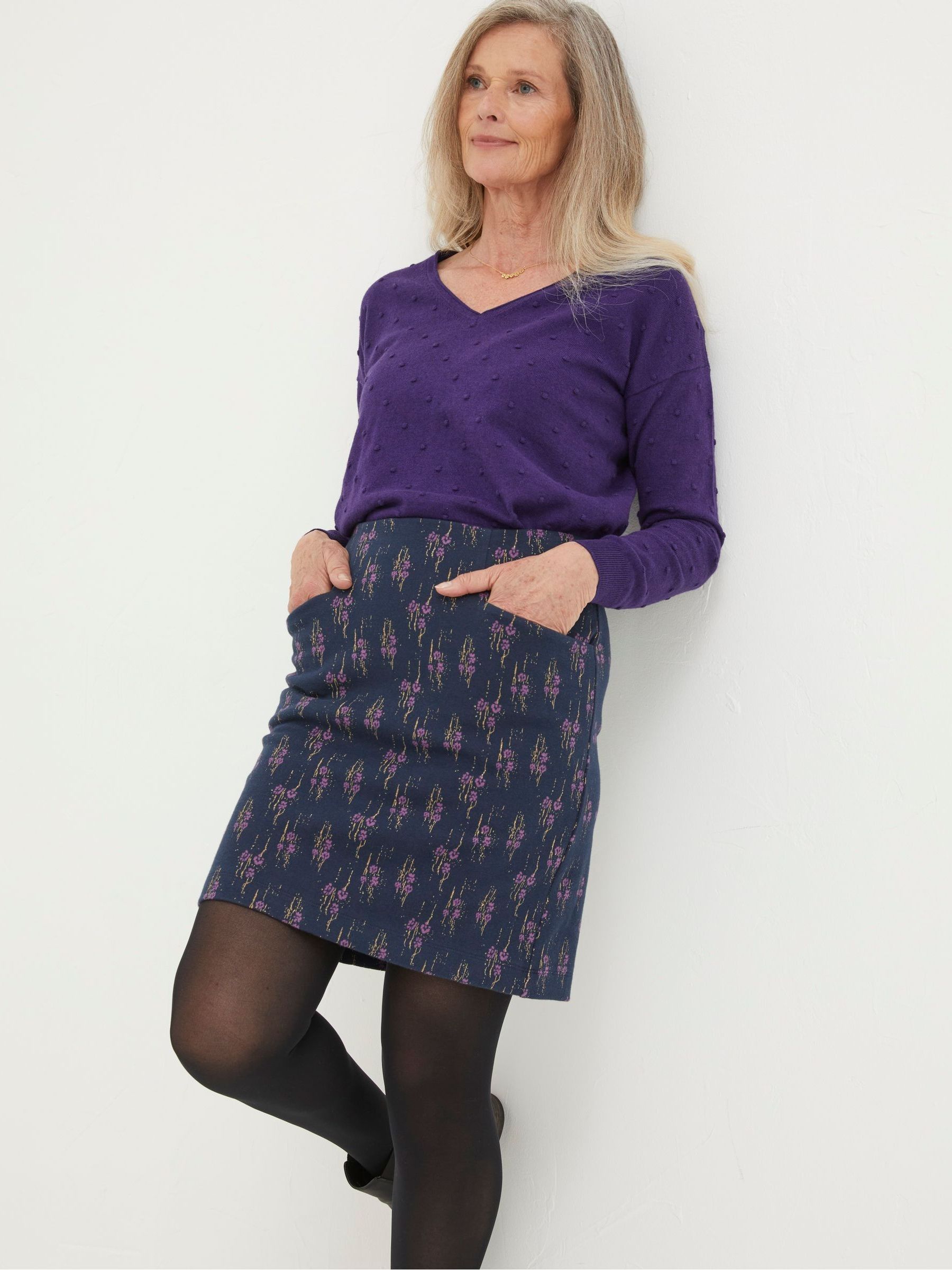 Whether you re meeting a friend for coffee or off for a wander in the city, our Jenni jersey skirt is easy to wear from AM to PM. The deep blue, inky colour, ditsy floral pattern and front pockets make this piece stand out from the crowd. Complete the look with tights and your favourite pair of Chelsea boots.