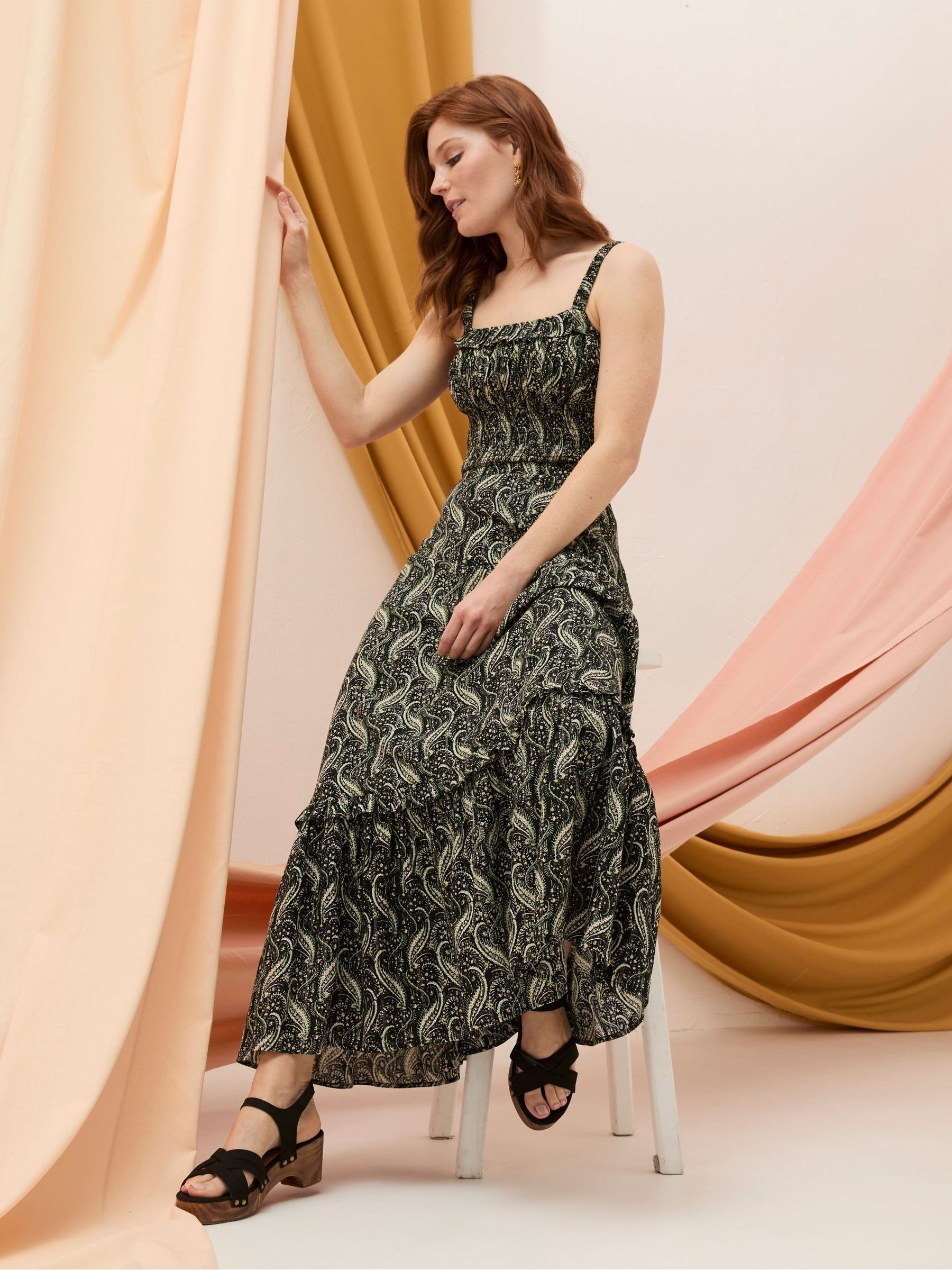 Make a sweeping statement with our Vita paisley maxi skirt. Ideal for sundowners, cocktail parties or bridal showers, this skirt is made for all your summer socials. It s been carefully crafted with 99% cotton with a touch of metallic fibres to give it beautiful movement and visual interest. Not to mention the stunning tiered effect. Wear it as a co-ord or mix and match it with camisoles and blouses. Regular waistband to hem 39" / 99cm.