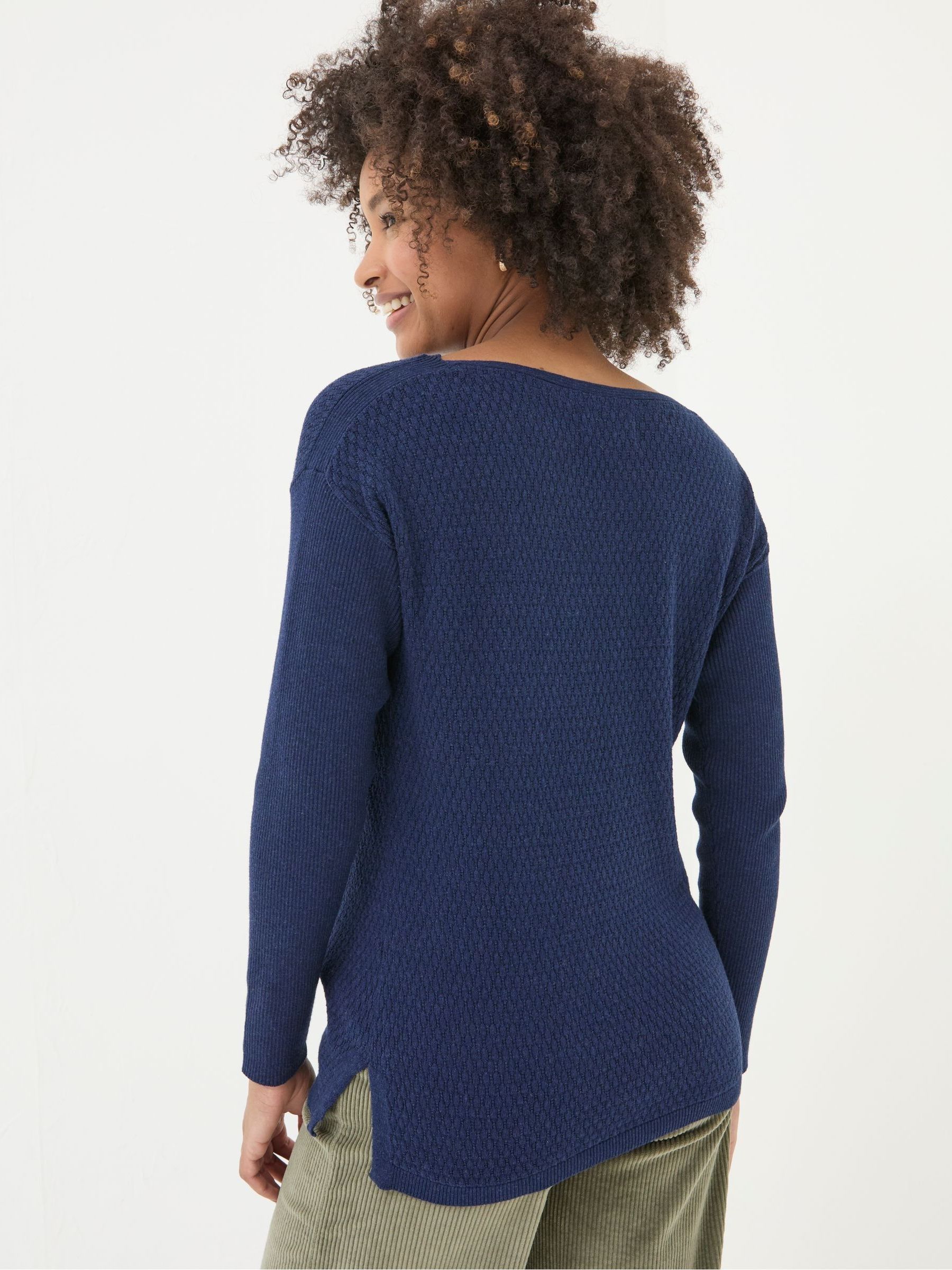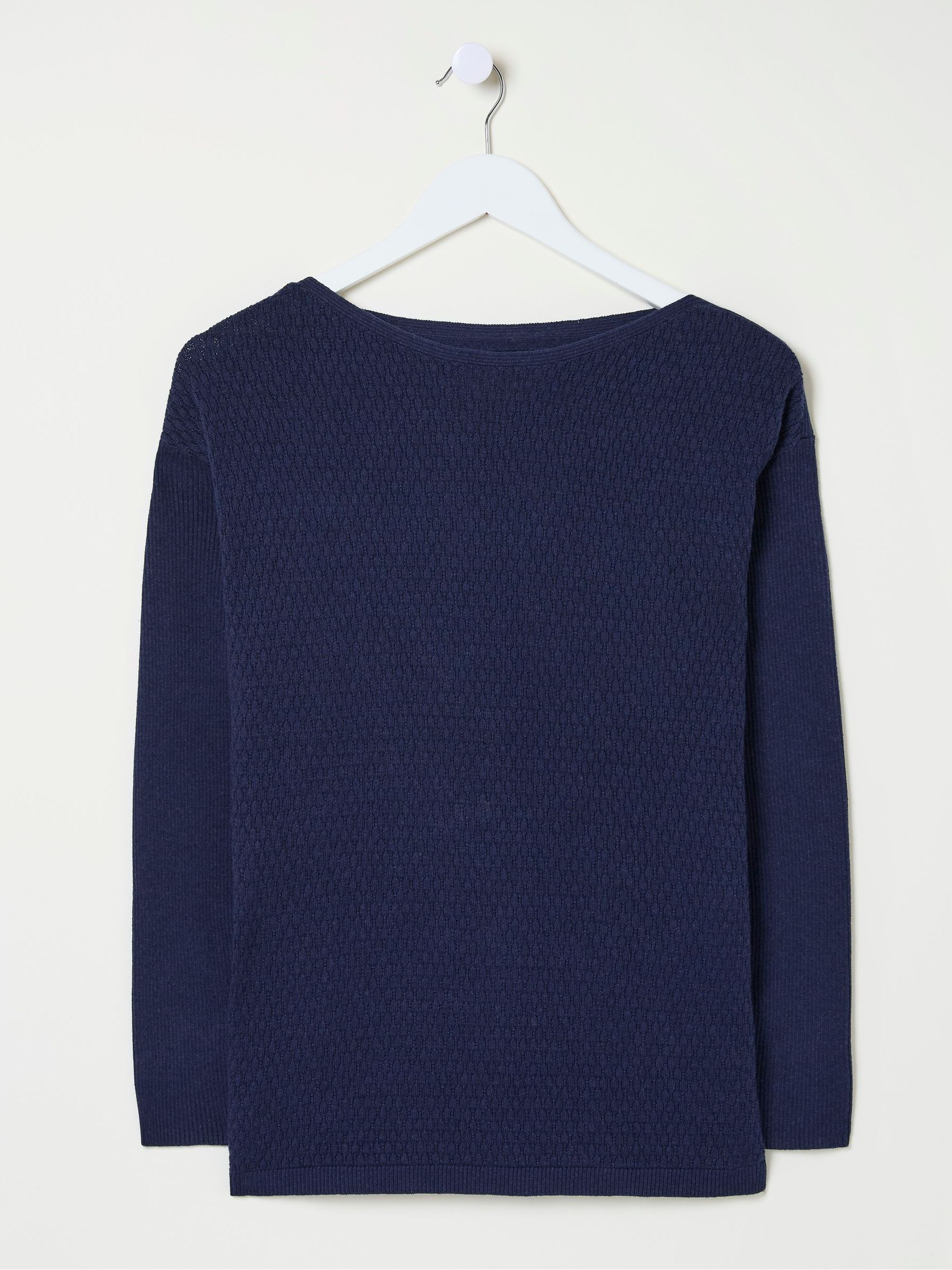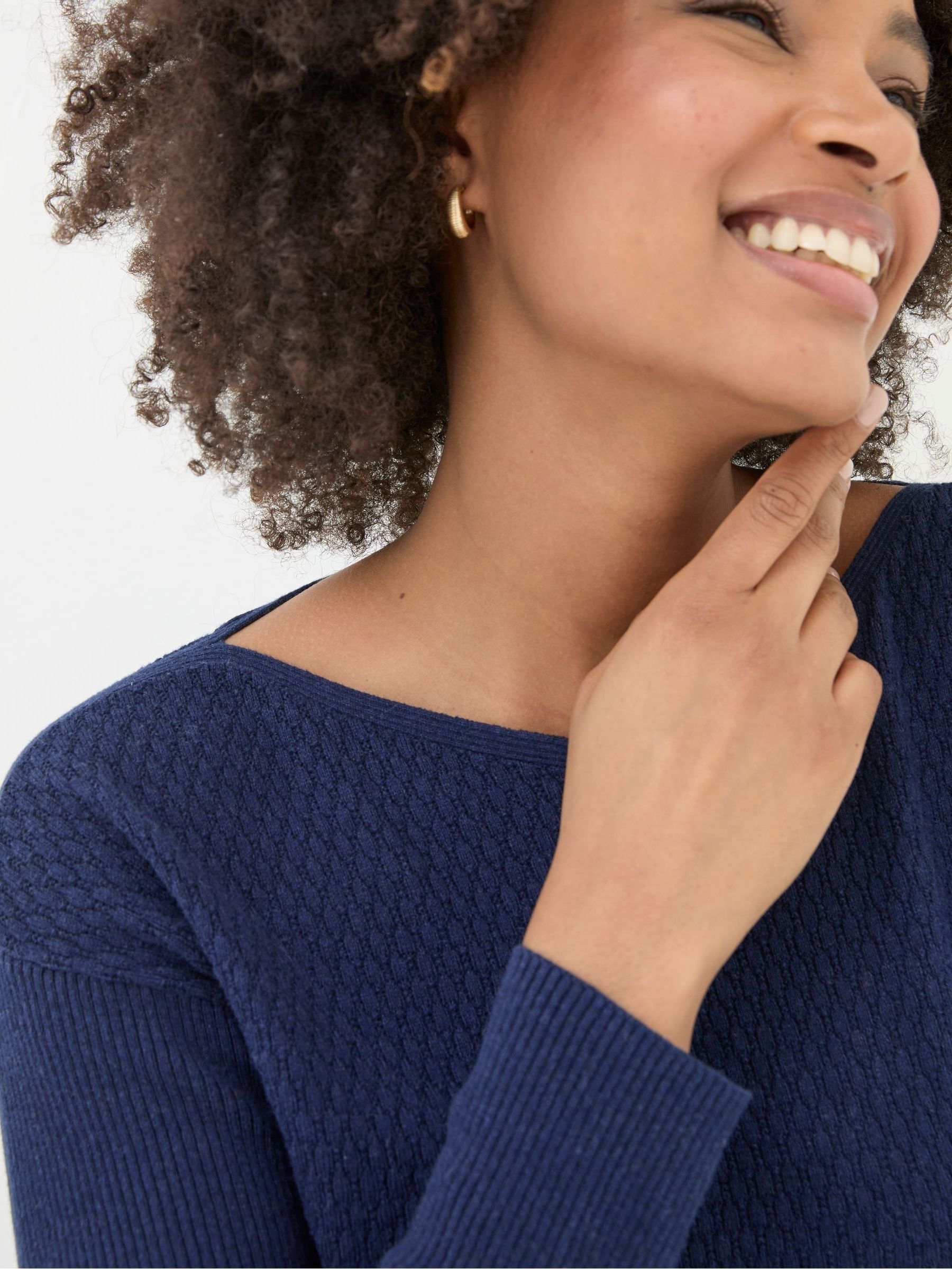 Every wardrobe needs this blue jumper. Our Sophie boat neck jumper is a timeless piece packed with features that make it an absolute style staple. Crafted with 100% cotton, it's supersoft, and figure flattering with close-to-body fit. Details such as the textured pattern, side split and boat neck elevate what would be a simple piece. Whether you’re lounging at home, heading to the office or going out, it’s guaranteed to capture attention.Made with 100% cotton Tonal pattern Supersoft