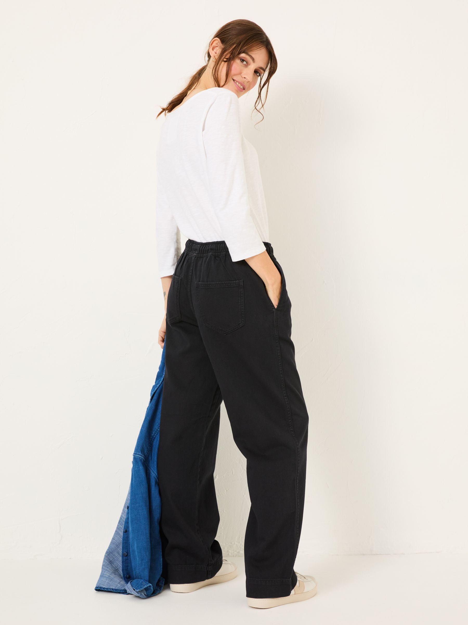 These charcoal grey pull-on style trousers are so comfortable, you'll be living in them season after season. That's because they re made from soft-touch cotton with an elasticated waistband for ease of movement. The leg is loose and wide, and even better – they've got pockets! From walks on the beach to lunch dates with friends, these trousers work for so many plans. Soft-touch cotton Elasticated waist with drawcords They've got pockets! Model is 5ft 9''/175cm and wears UK size 8 Long. Regular inside leg length 29" / 74cm. Long inside leg length 31" / 79cm.