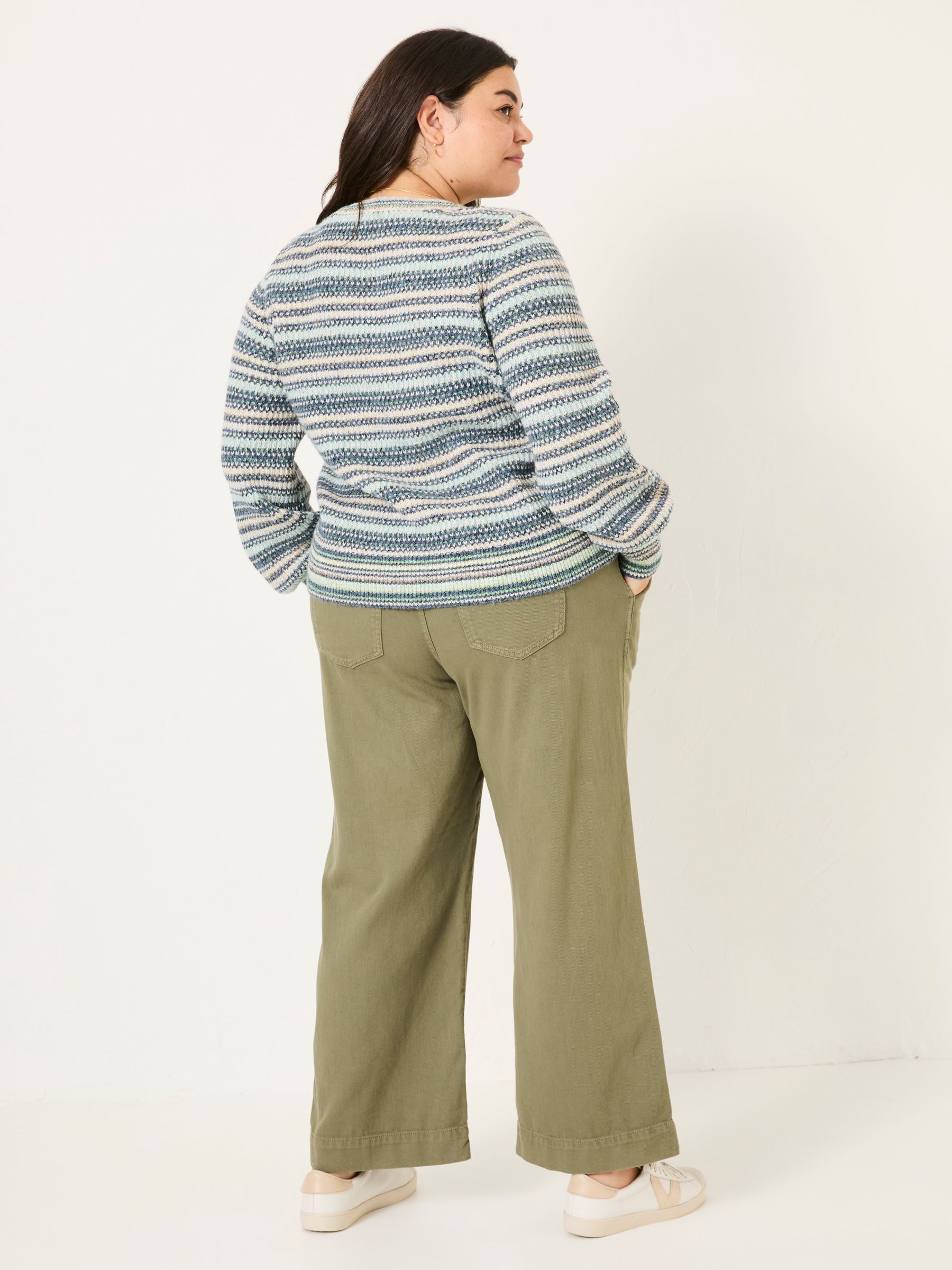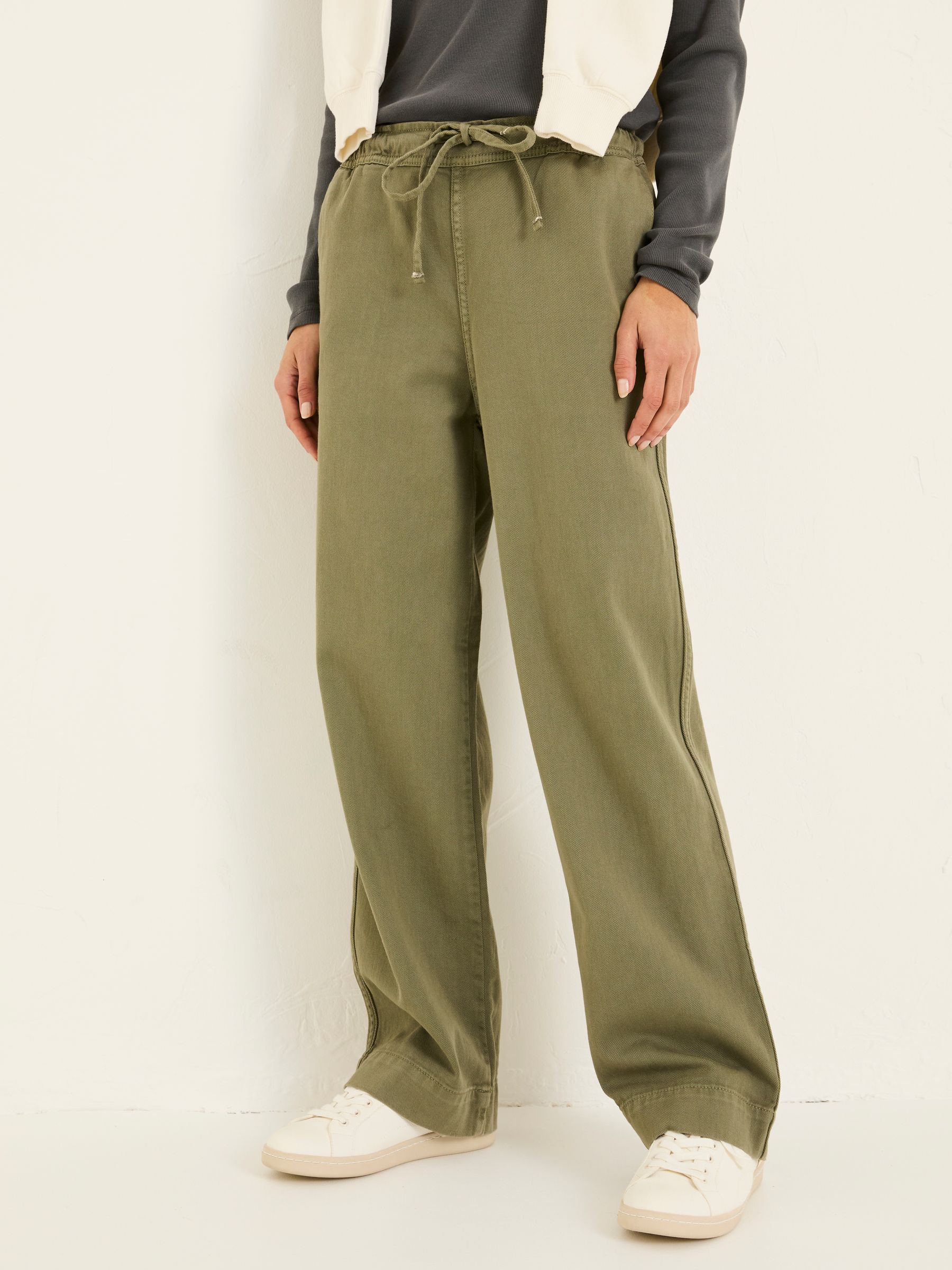 These khaki green pull-on style trousers are so comfortable, you ll be living in them season after season. That's because they're made from soft-touch cotton with an elasticated waistband for ease of movement. The leg is loose and wide, and even better – they've got pockets! From walks on the beach to lunch dates with friends, these trousers work for so many plans.