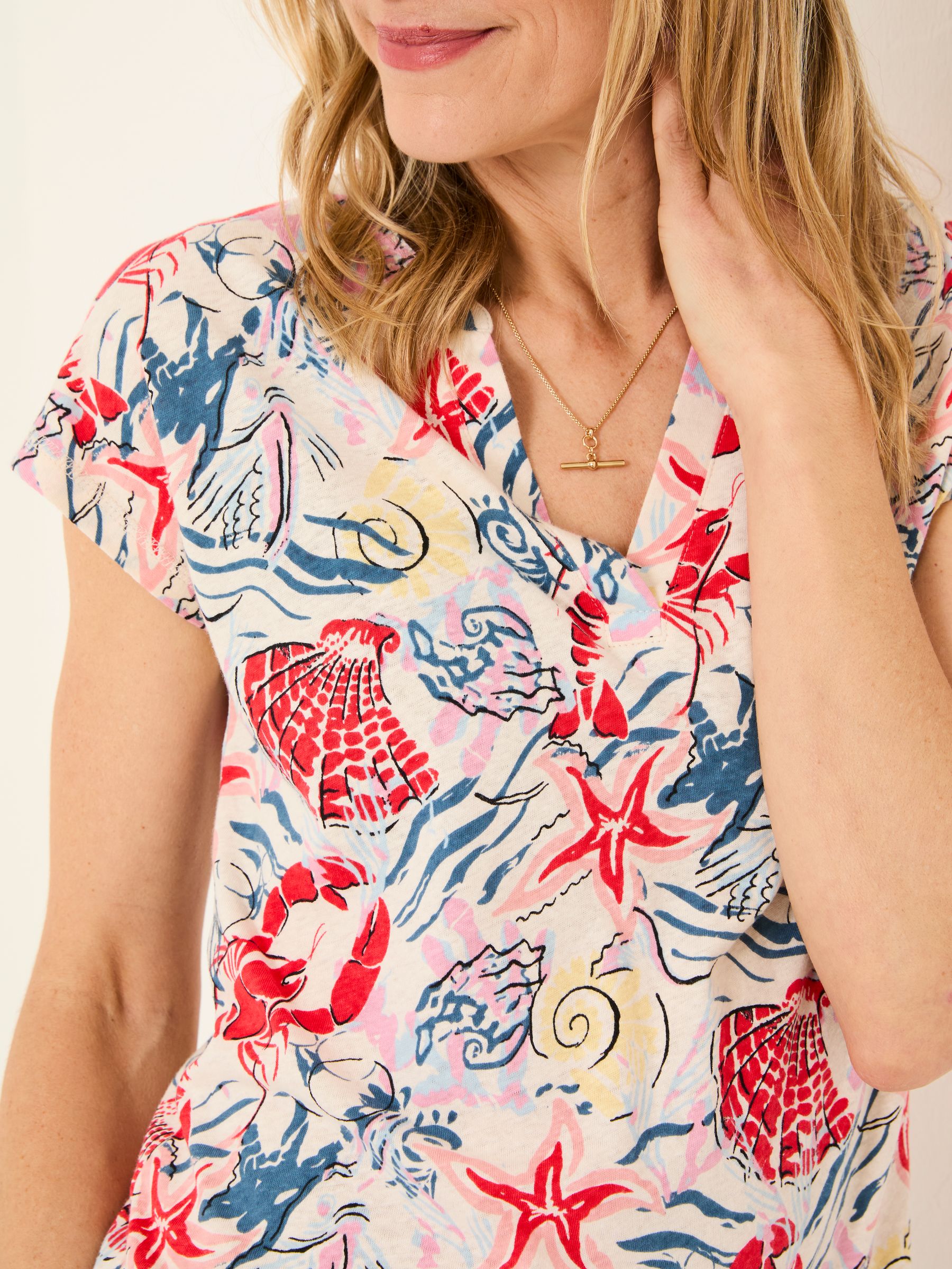 Our linen blend notch neck top features vibrant beach-themed pattern that brings a playful, coastal charm. The lightweight linen blend keeps you cool, while the notch neck adds a touch of relaxed style. Perfect for vacation strolls, weekend brunches, or beachside hangouts - pair it with shorts and sandals for a laid-back look or dress it up with white jeans and wedges. Model is 5'9''/175cm and wears UK size 8