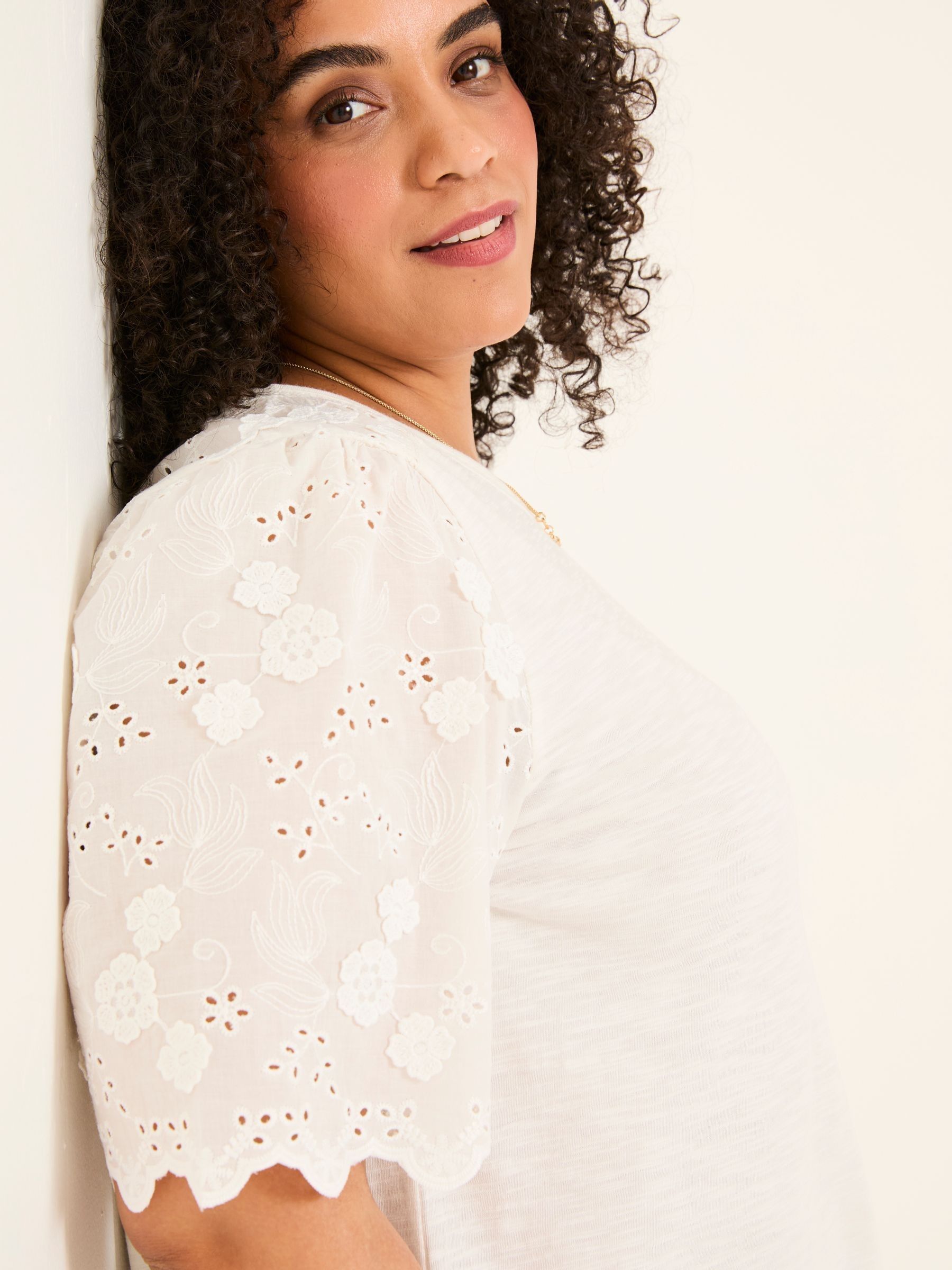 Our broderie top adds a touch of elegance with delicate floral embroidery and scalloped edges on the sleeves. The soft, breathable fabric and airy design makes it perfect for those sunny days. Pair it with denim shorts for a casual outing or dress it up with a skirt and sandals for drinks in the sun. Model is 5'8''/173cm and wears UK size 18