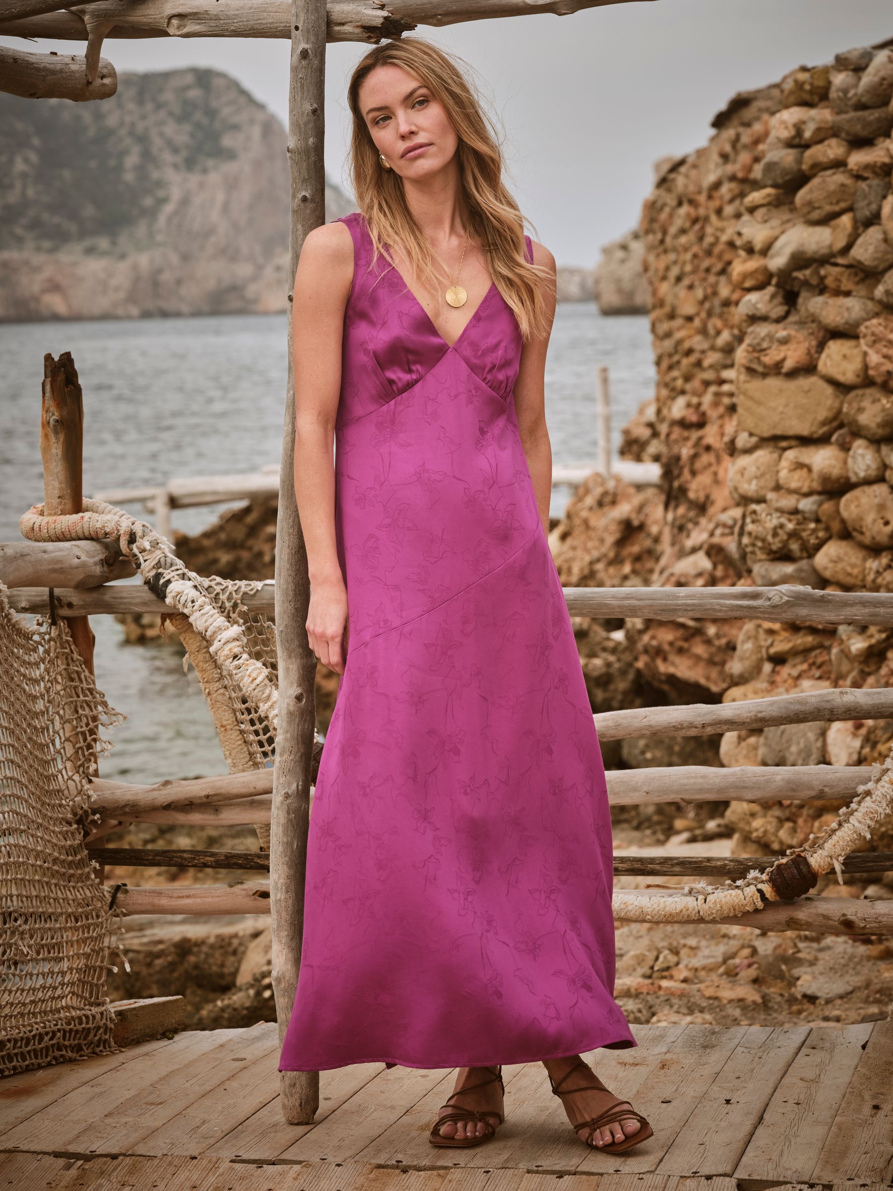 Copper & Black: FatFace, all dressed up. We're here for a summer you'll want to remember, in styles you won't forget. So save the date and shop our collection of elevated styles and finishes that have been exclusively designed for your special moments. Turn heads in our Josephine slip dress - an effortlessly elegant statement piece designed for unforgettable moments. A deep V-neckline frames the collarbone beautifully, while a subtle side slit adds just the right amount of drama. The rich purple satin finish catches the light with every step, offering a breathable, lightweight feel that’s perfect for warm evenings. Whether you're dressing for a summer wedding or an elegant holiday dinner, this dress delivers bold sophistication with ease. A standout addition to any occasion wardrobe. Model is 5'8''/173cm and wears UK size 18 Regular