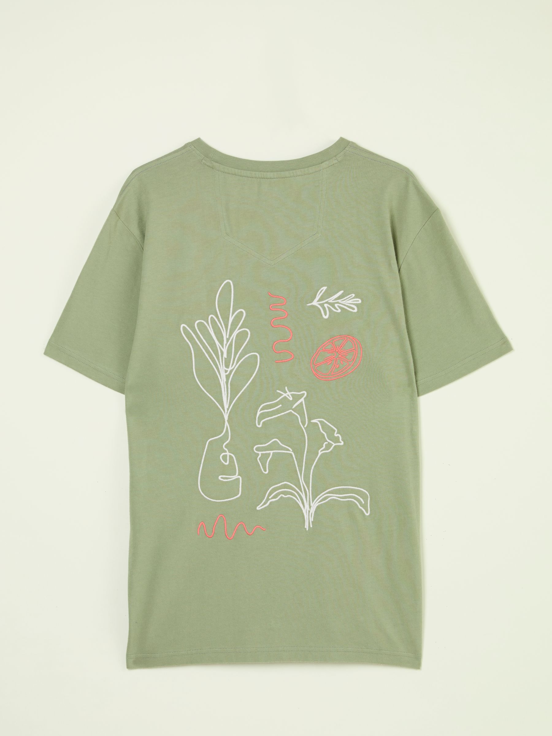 Light Green Embroidered Abstract Plants 100% Cotton T-Shirt