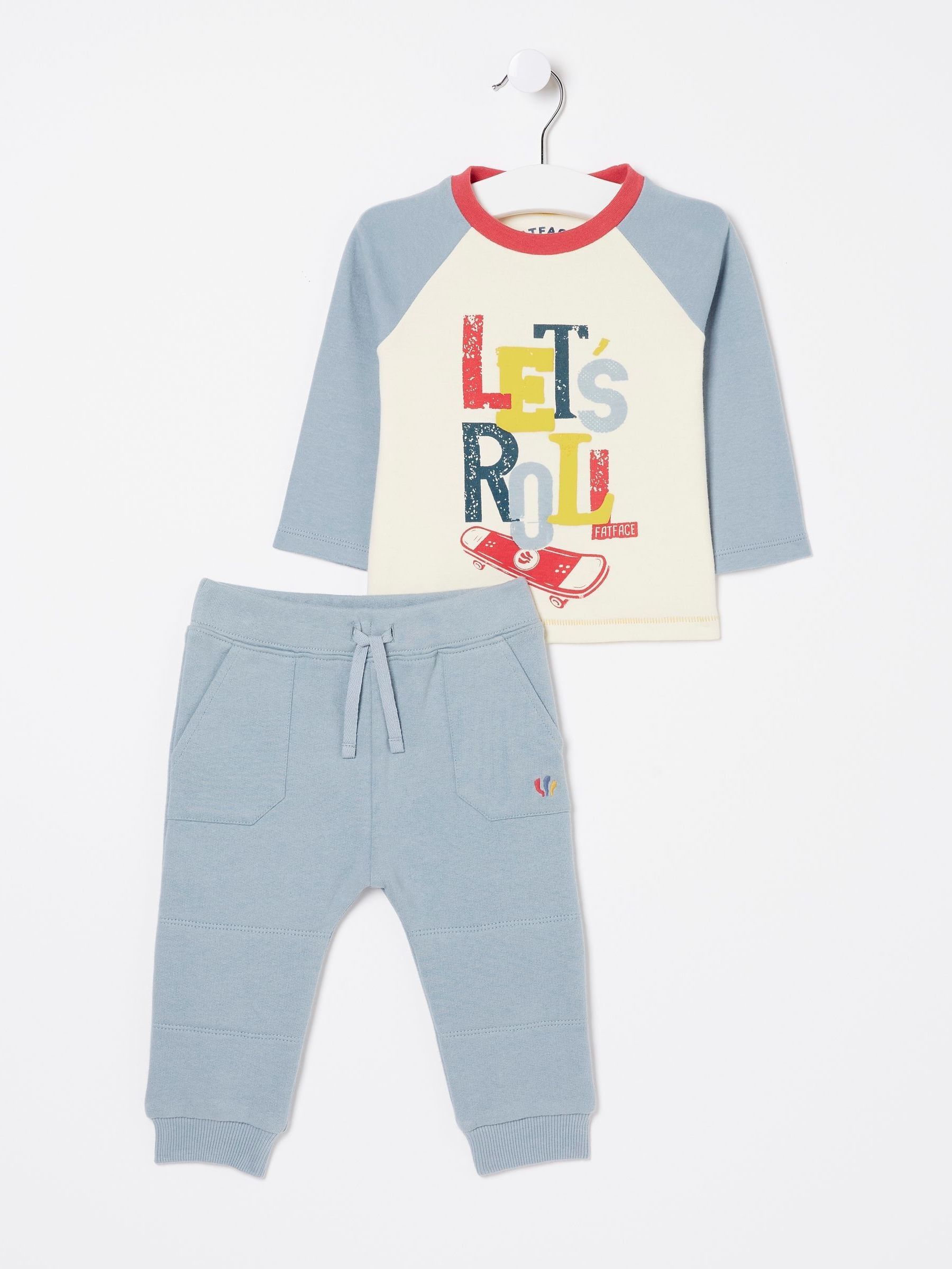 With a bright graphic to add a touch of style and raglan sleeves for a little contrast, the set includes some cosy joggers that feel breathable and soft to the touch.
