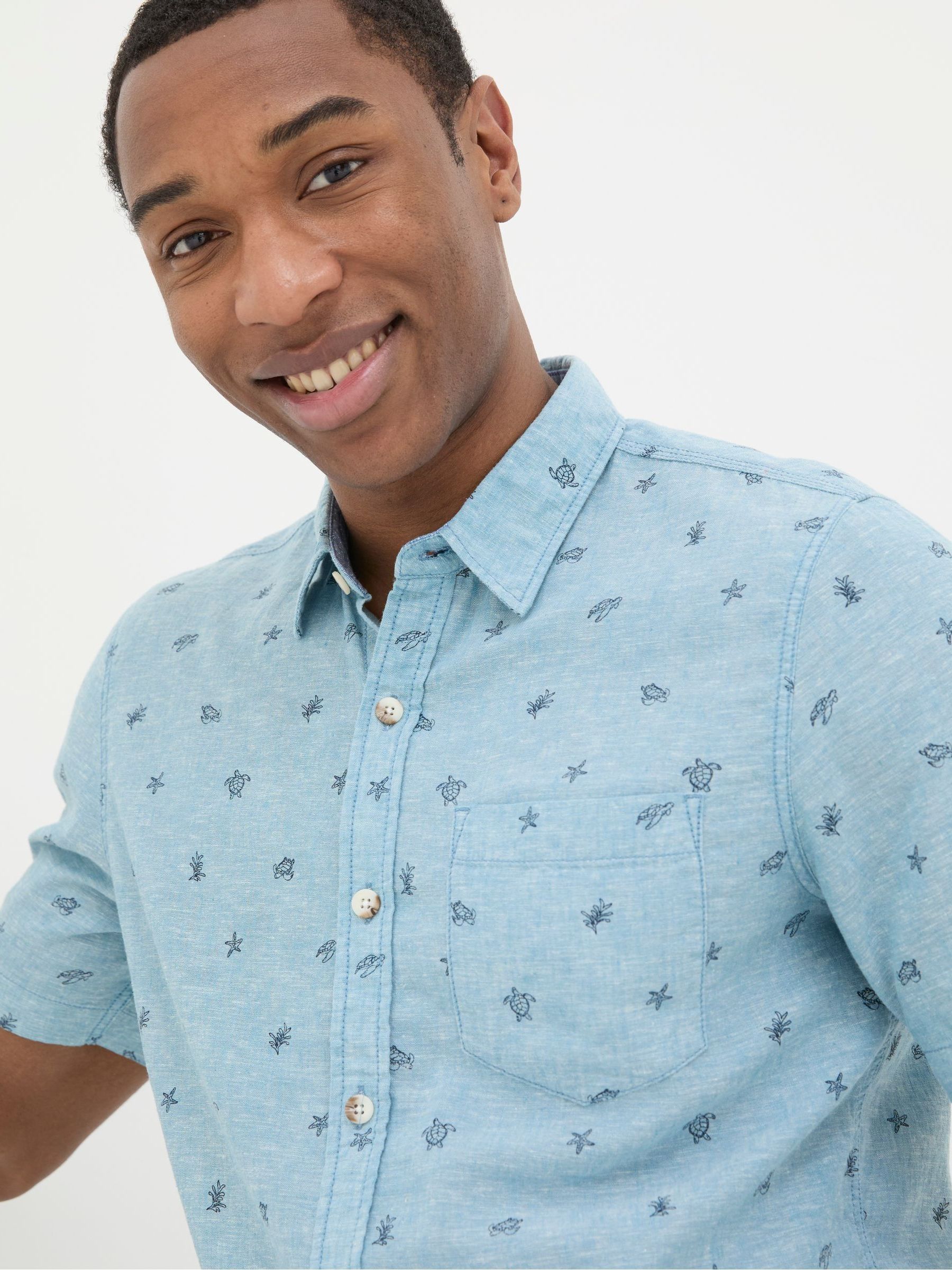 Keep your style cool this season with a Turtle print shirt, made with a light and airy cotton linen blend.