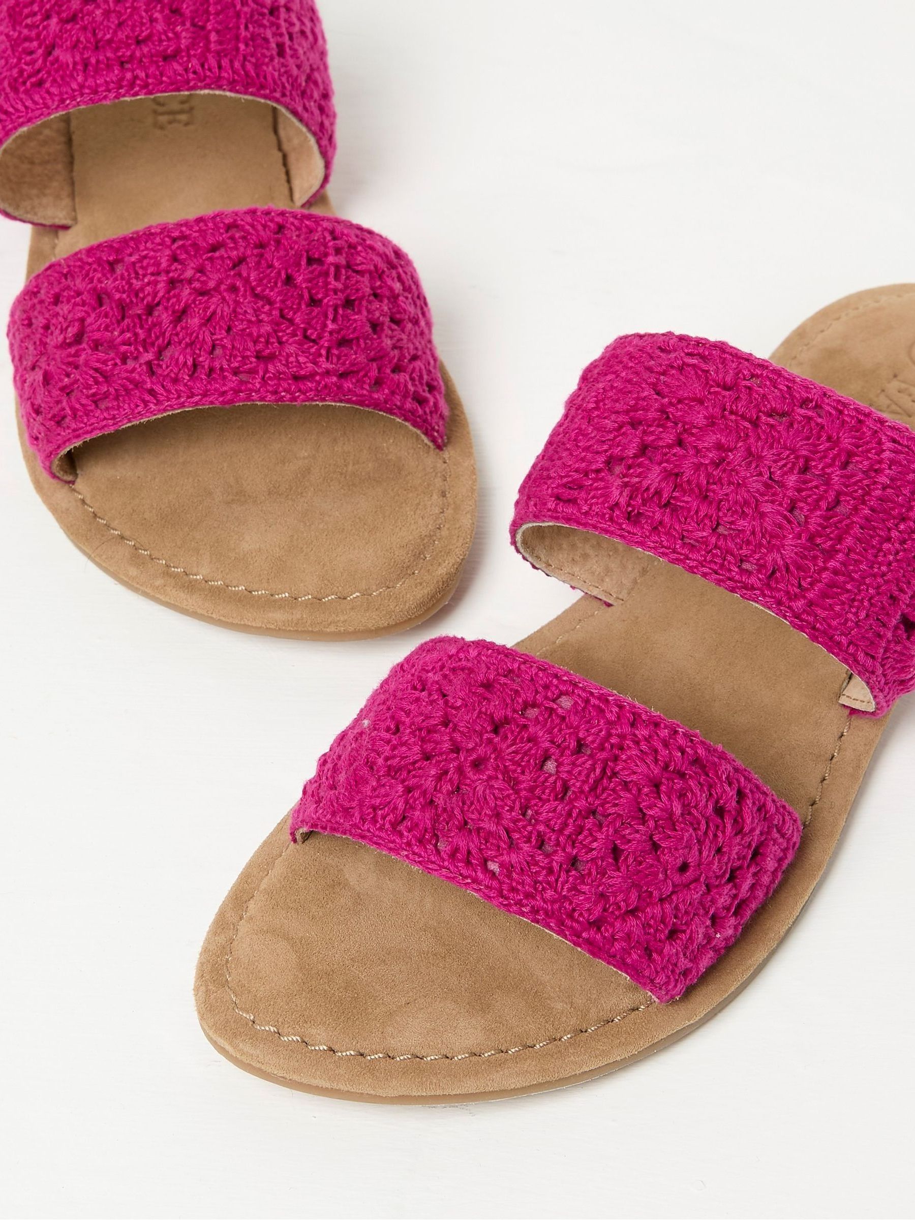 Tailored for comfort, our Penelope pink slides feature a super on-trend crochet band for style and versatility.