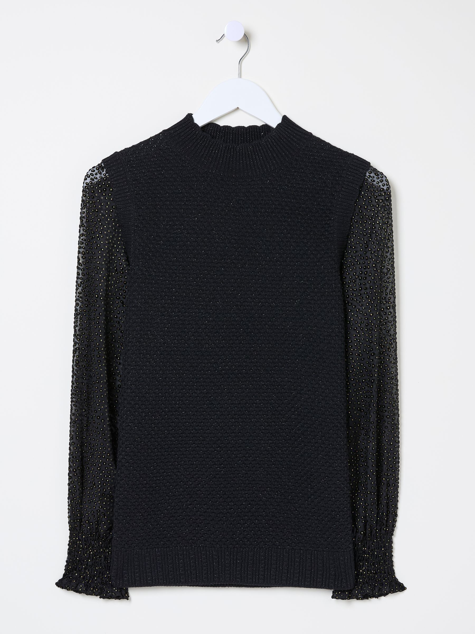 Body 54% Cotton, 43% Recycled polyester, 3% Metallised fibre. Rib 53% Cotton, 40% Recycled polyester, 4% Nylon, 2% Metallised fibre, 1% Elastane. Sleeves 54% Nylon, 46% Viscose.