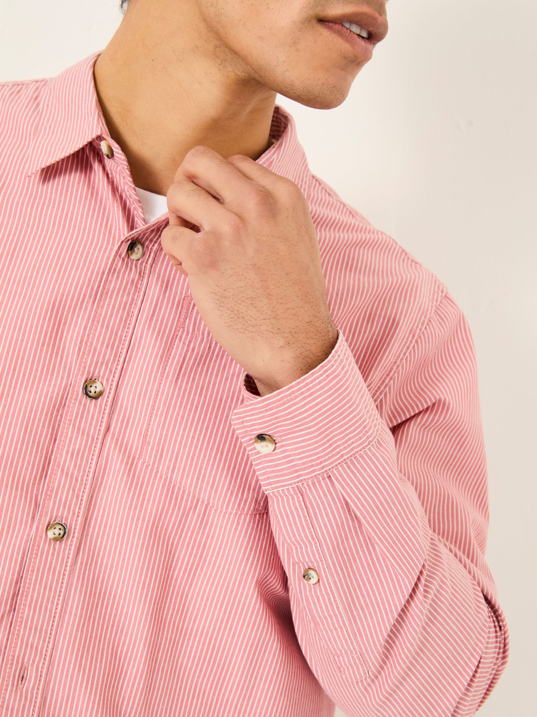 With a curved hem, single chest pocket and adjustable button cuffs, this versatile long-sleeve shirt definitely earns its stripes. You can dress it smart with chinos and leather shoes or keep it more casual worn under a gilet for a weekend walk. Plus, the just-right fit offers comfort you can count on. Model is 6'1''/185cm and wears UK size M