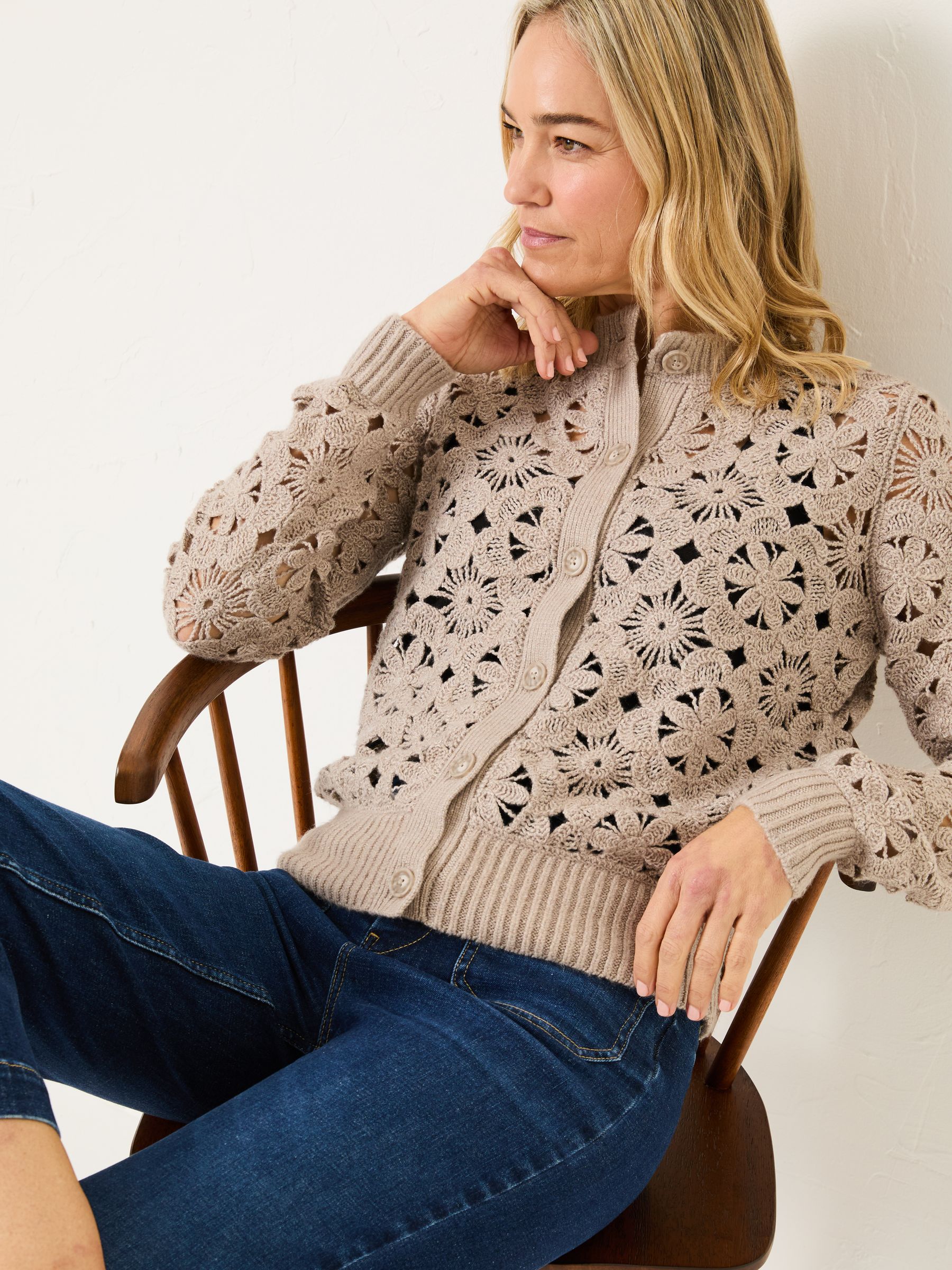 Finished with a beautiful crochet pattern, this long-sleeve cardigan brings both warmth and an extra-special finish to any outfit it's worn with. Crafted from a soft blend of materials, including nylon, it's perfect for layering over your favourite tops, blouses and dresses. Partly made from recycled materials Beautiful crochet pattern Ribbed neck, cuffs and hem Model is 5ft 9''/175cm and wears UK size 8.