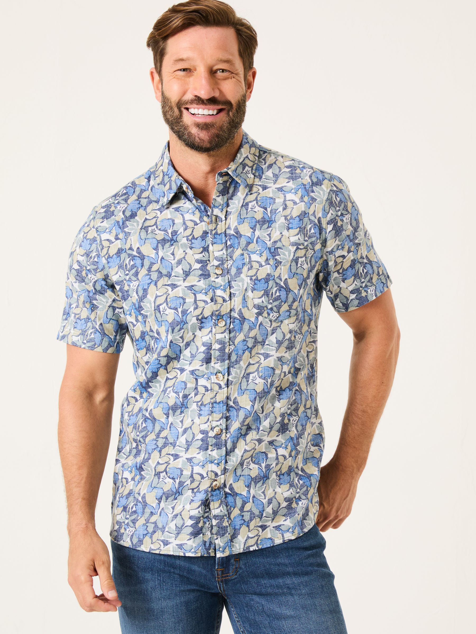 Bring autumn vibes to your wardrobe with our blue leaf-print shirt. Styled for everyday adventures, it has a curved hem, pointed collar and short sleeves that make these shorts easy to layer all year round. Made from soft cotton Available in tall fit Short sleeves Curved hem