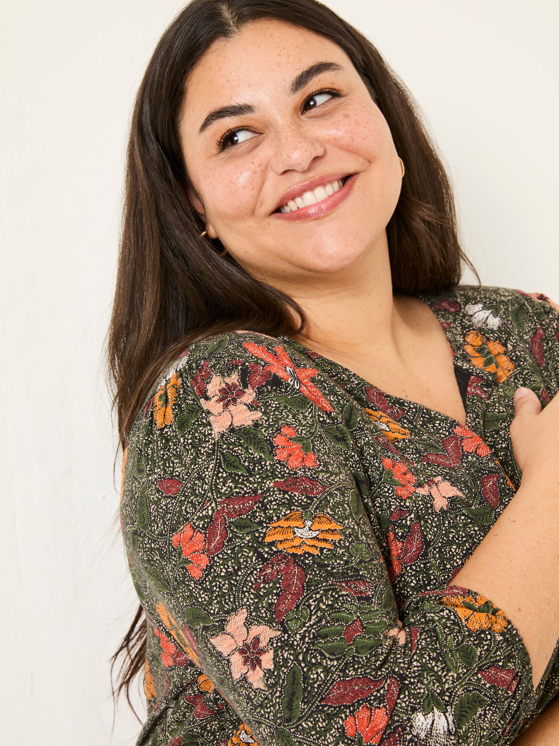 Brighten up your everyday outfits with our floral-print Enya tunic. Flattering and oh-so comfortable to wear, it features a relaxed fit and slightly longer length for a beautiful shape over your favourite jeans, trousers and skirts. Supersoft cotton-modal Flattering longer-length fit Notched V-Neck with modesty panel 3/4 length sleeves Measurements: Model is 5ft 9''/175cm and wears UK size 8 Model is 5ft 10''/178cm and wears UK size 18