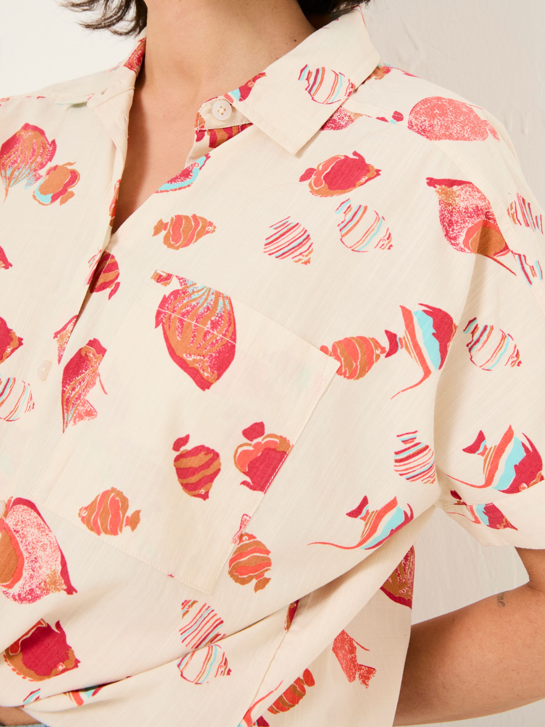Stylish and smart, our Sanchez shirt is the ultimate summer shirt. She features a gorgeous shoal print, short sleeves and a slightly cropped length for a flattering fit. Pair her with your favourite shorts over a bikini or wear buttoned up with a skirt for evening outings. She is soft and breathable making her the perfect lightweight shirt for all your summer plans.