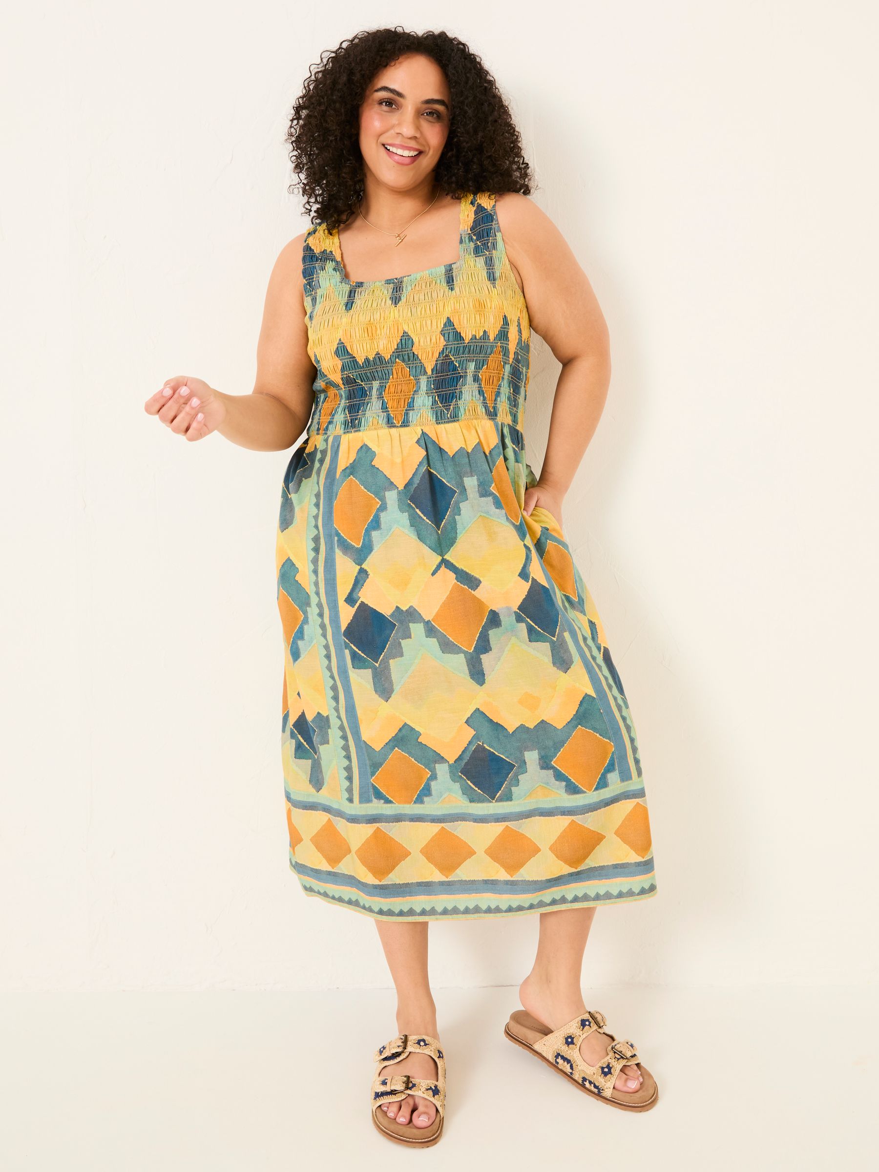 Our Aria Multi Abstractmidi dress is perfect for those warm summer days, featuring a shirred bust for a comfy, flattering fit and a flowy silhouette with a vibrant patchwork print.