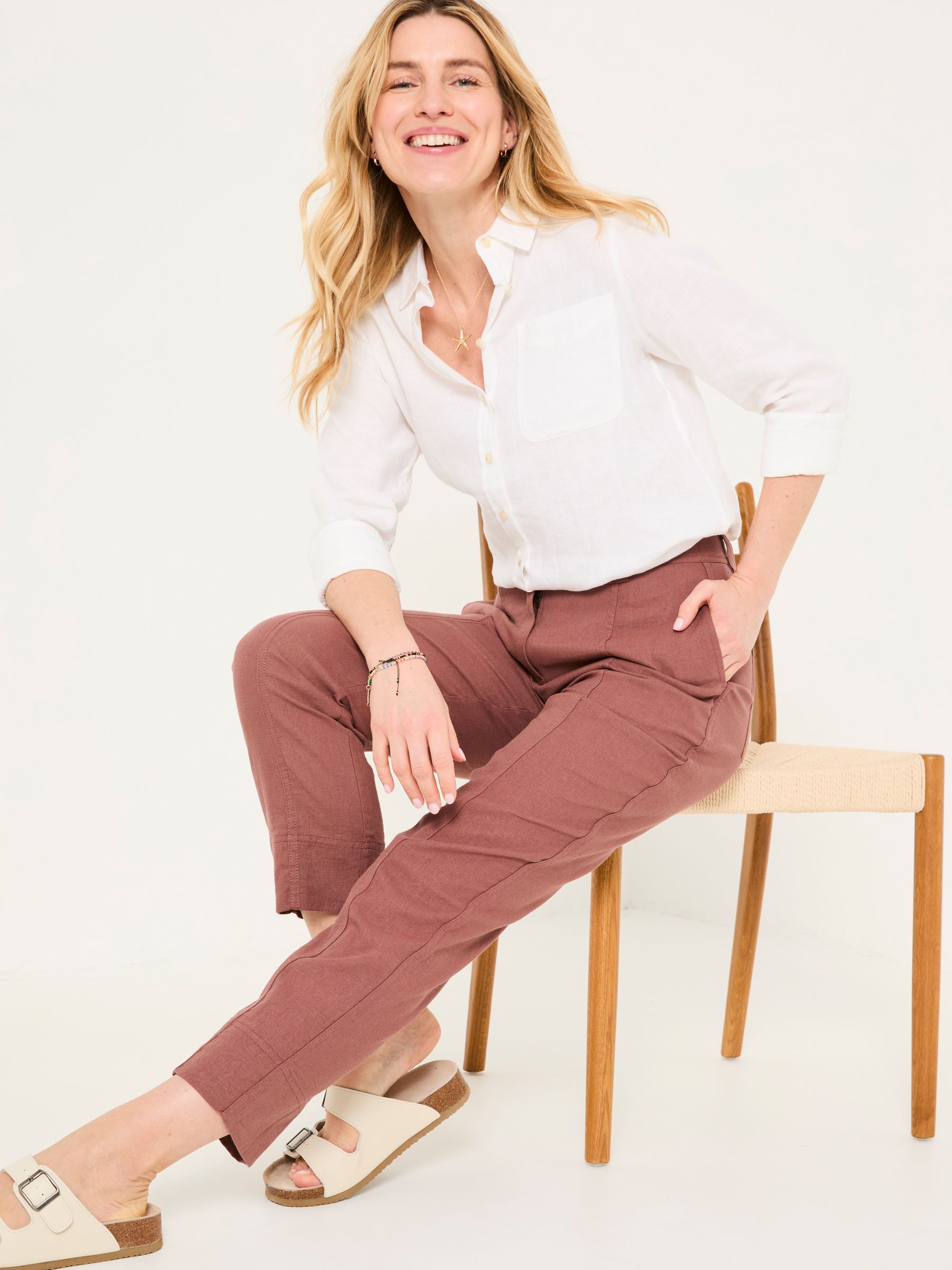 Our Issy linen blend trousers are an essential smart-casual option for your wardrobe, from office days to relaxing at the beach. They feature a a stretchy waistband, handy pockets and a flattering tapered shape. Pair with a blouse and loafers for a work look or trainers and a knit for those casual weekend strolls, the opportunities are endless.