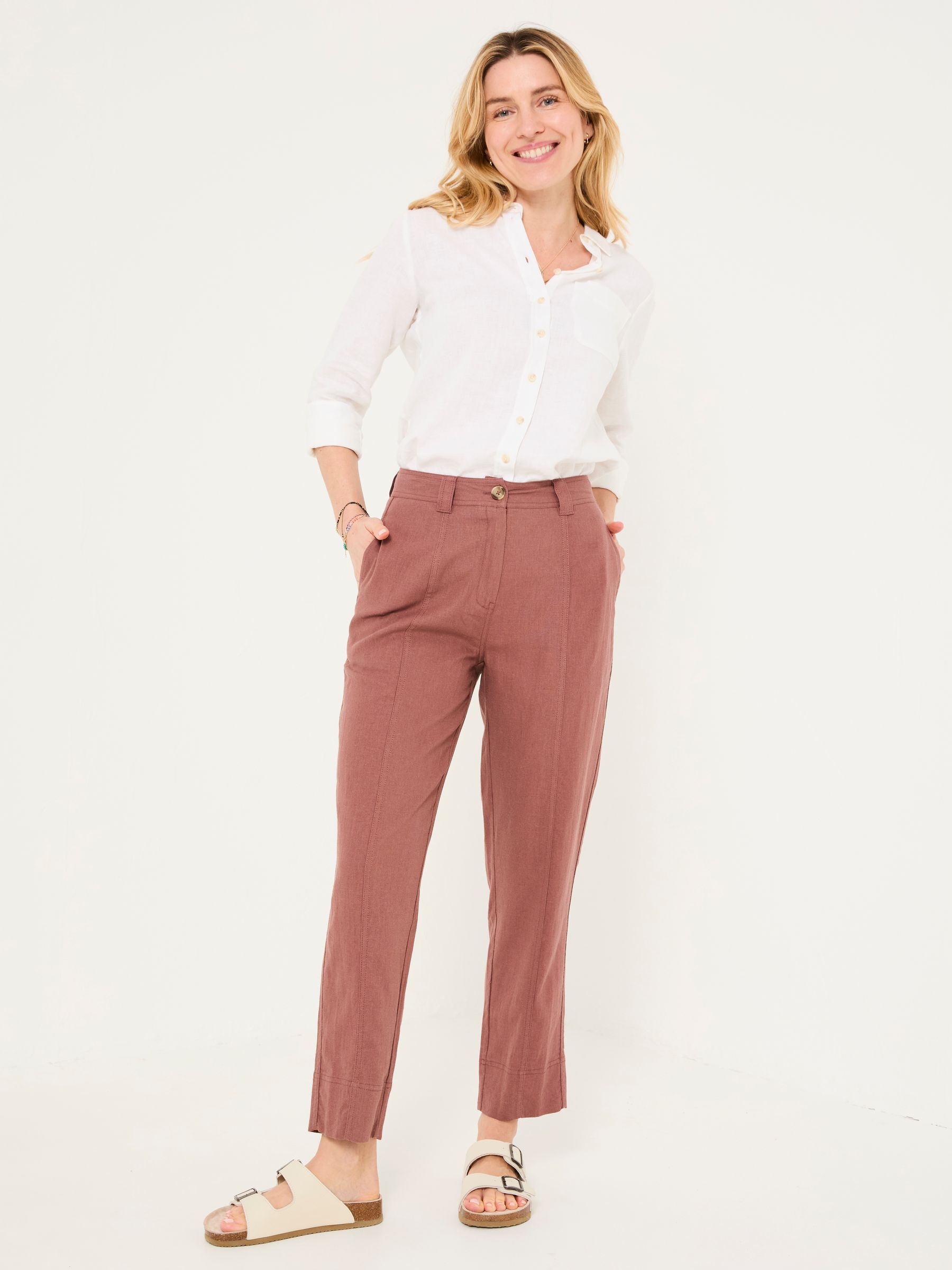 Our Issy linen blend trousers are an essential smart-casual option for your wardrobe, from office days to relaxing at the beach. They feature a a stretchy waistband, handy pockets and a flattering tapered shape. Pair with a blouse and loafers for a work look or trainers and a knit for those casual weekend strolls, the opportunities are endless. Model is 5'9''/175cm and wears UK size 8 Long Short inside leg length 26" / 66cm. Regular inside leg length 26" / 66cm. Long inside leg length 28" / 71cm.