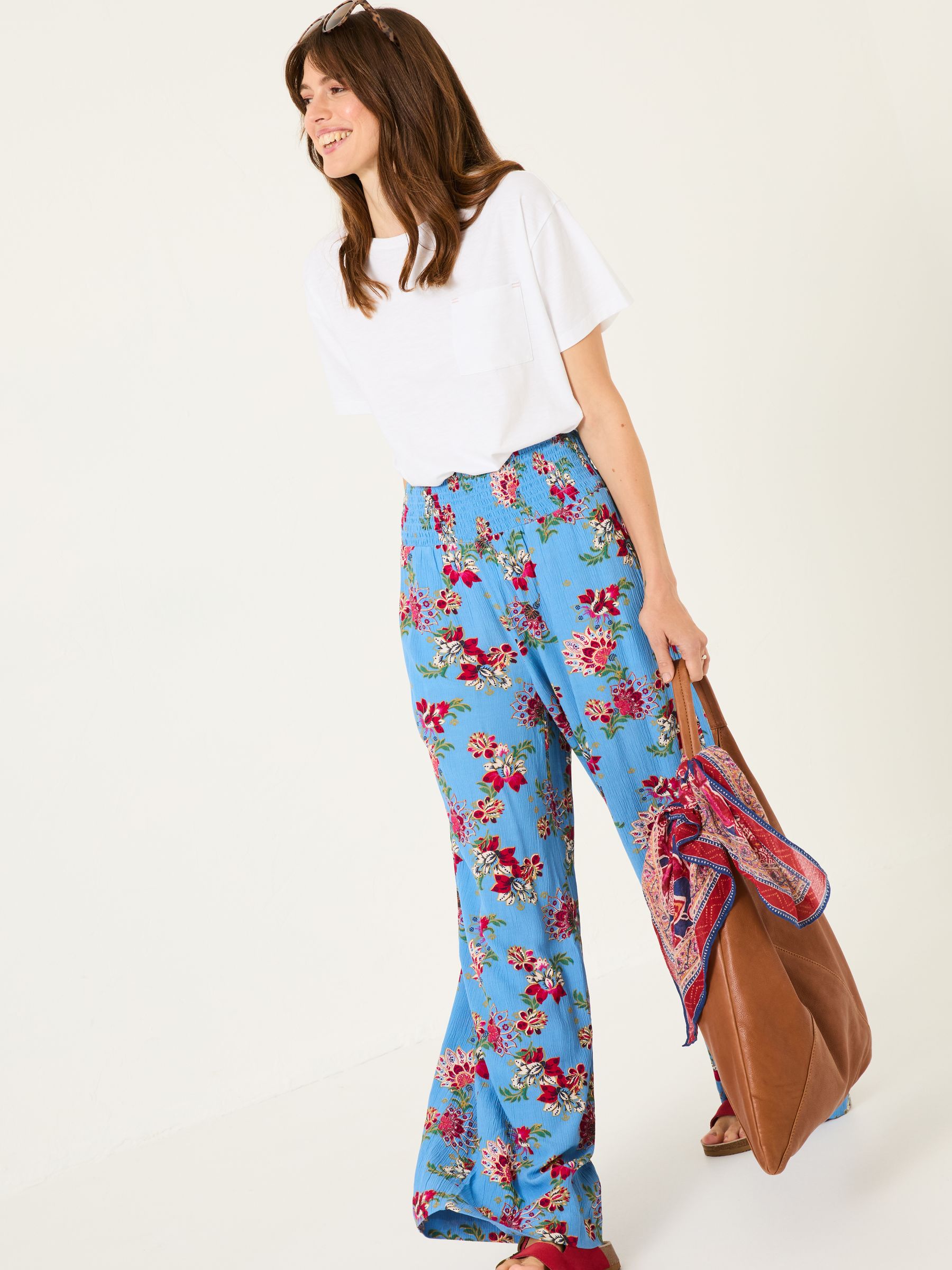 With a wide leg and a bold floral print inspired by the sights and colours of Bali, the Balinese Palazzo Trousers are light, breathable and finished with a wide stretchy shirred waist for an exceptionally comfortable fit. Even better – they have side pockets! Made from viscose Wide-leg fit Wide elasticated waistband Model is 5ft 9''/175cm and wears UK size 8 Long.