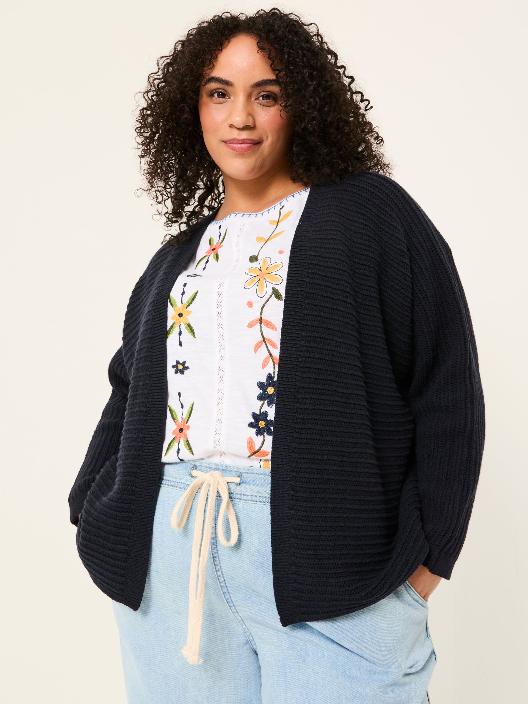 Crafted with a beautifully textured knit, our indigo blue Kya Kimono Cardigan is perfect for layering over your favourite dresses, tops, shirts, and blouses this season. Its finished with ribbed detailing and a flattering kimono shape that's both warm and comfortable. Textured fabric Ribbed cuffs and trim Model is 5'9''/175cm and wears UK size 8