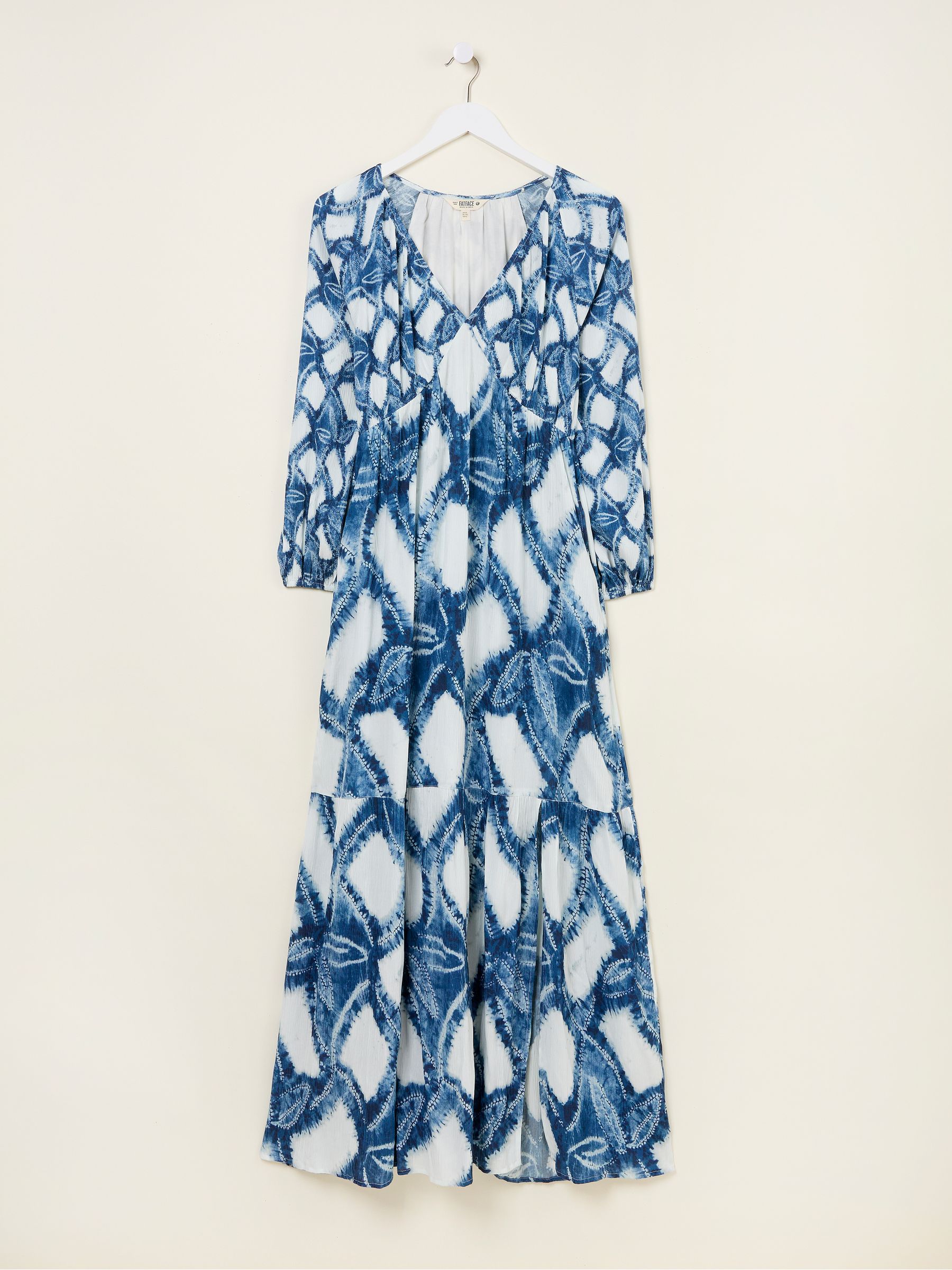 Dive into effortless elegance with our Noelle maxi dress, inspired by the deep sea. Designed with a flattering V-neckline, empire waist, and subtle ruching, it offers the perfect blend of comfort and style. The cuffed long sleeves and flowing tiered skirt create a beautifully versatile silhouette that flatters every shape. And, of course, it wouldn’t be complete without our signature FatFace touch - it has pockets! Model is 5'8''/173cm and wears UK size 18 Regular