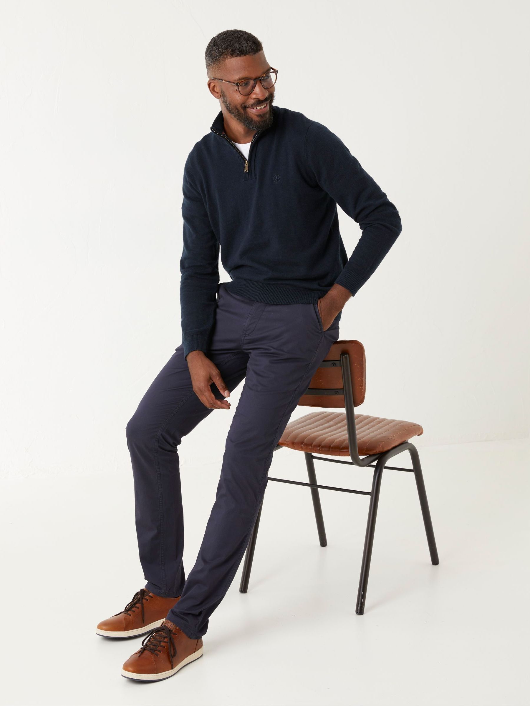 Made with lightweight yet hard-wearing fabric with a touch of stretch for movement and comfort, these Blue chinos are the perfect pair for casual days or dressing smart. We've slimmed down the fit through the leg for a modern look and added lots of details such as the embroidered logo on the hip, branded buttons and branded zip pull. Style, comfort and quality combined! Regular inside leg length 31.5" / 80cm. Long inside leg length 33.5" / 85cm.