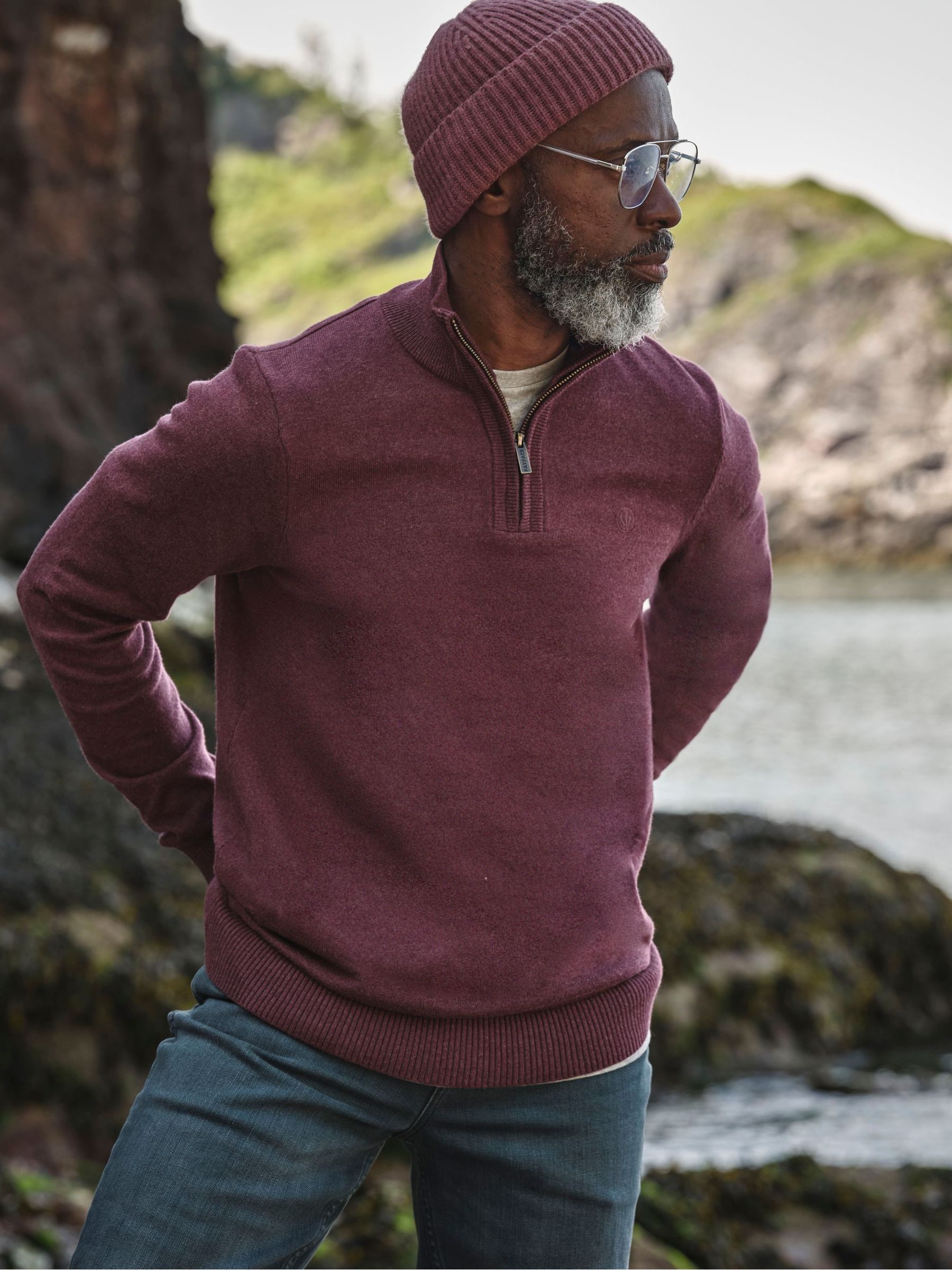 Add a little bit of luxury to your wardrobe with our Rye Cotton Cashmere Half Neck Jumper in burgundy red. It comes with 5% cashmere in the fabric, making it feel incredibly soft. The stretch cuffs and hem add shape and keep out the chill (always handy), and it's so easy to dress up with chinos or down with jeans. Oh, it's machine washable too! Contains supersoft cashmere Comfortable fit Zip-up half neck Stretch cuffs and hem